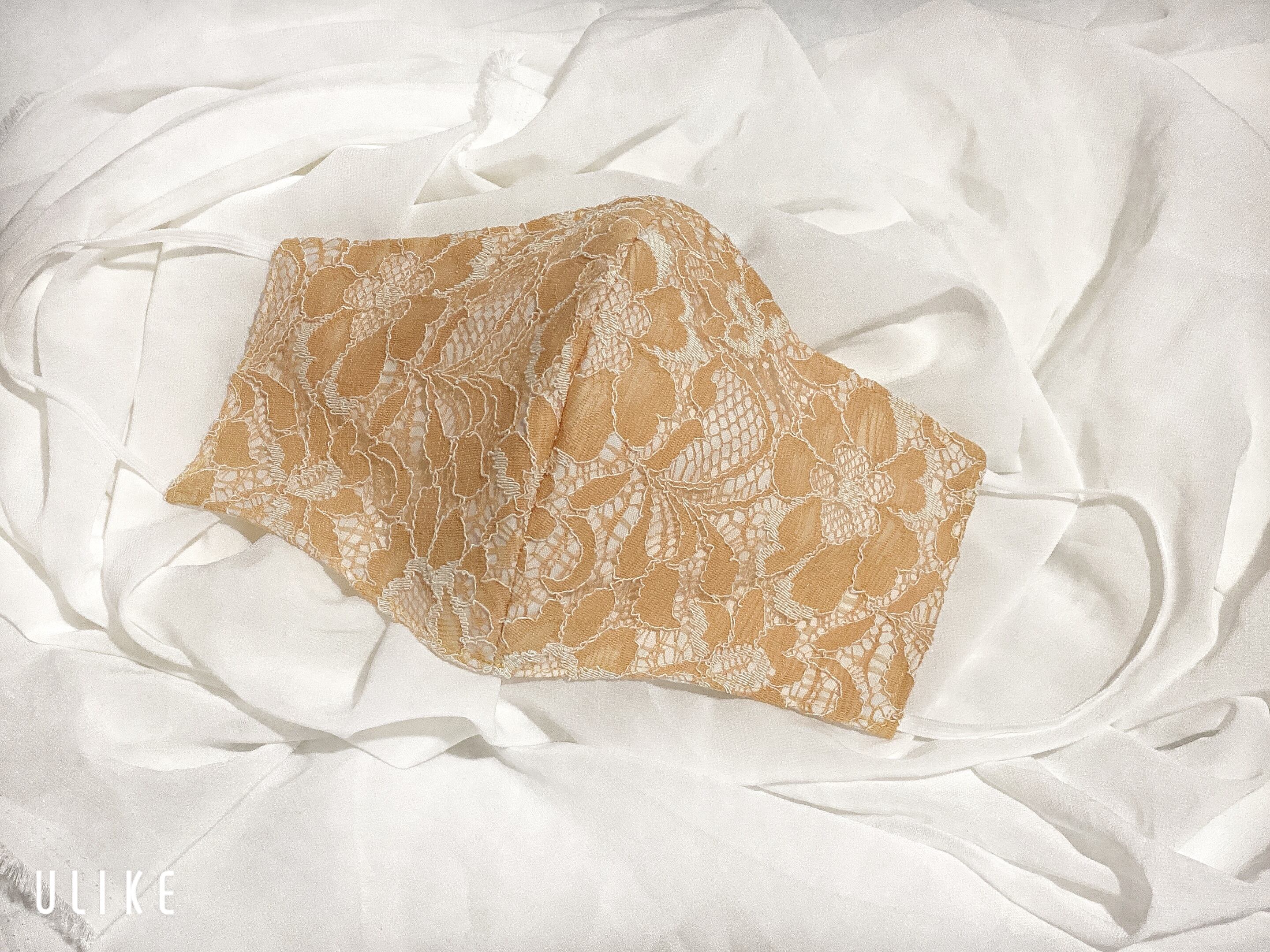 柔らかなオレンジとオフホワイトの2色で構成された大変珍しく繊細で上品な高級レースを贅沢に使用、品がありお洒落としても使えるマスクに仕上げました。