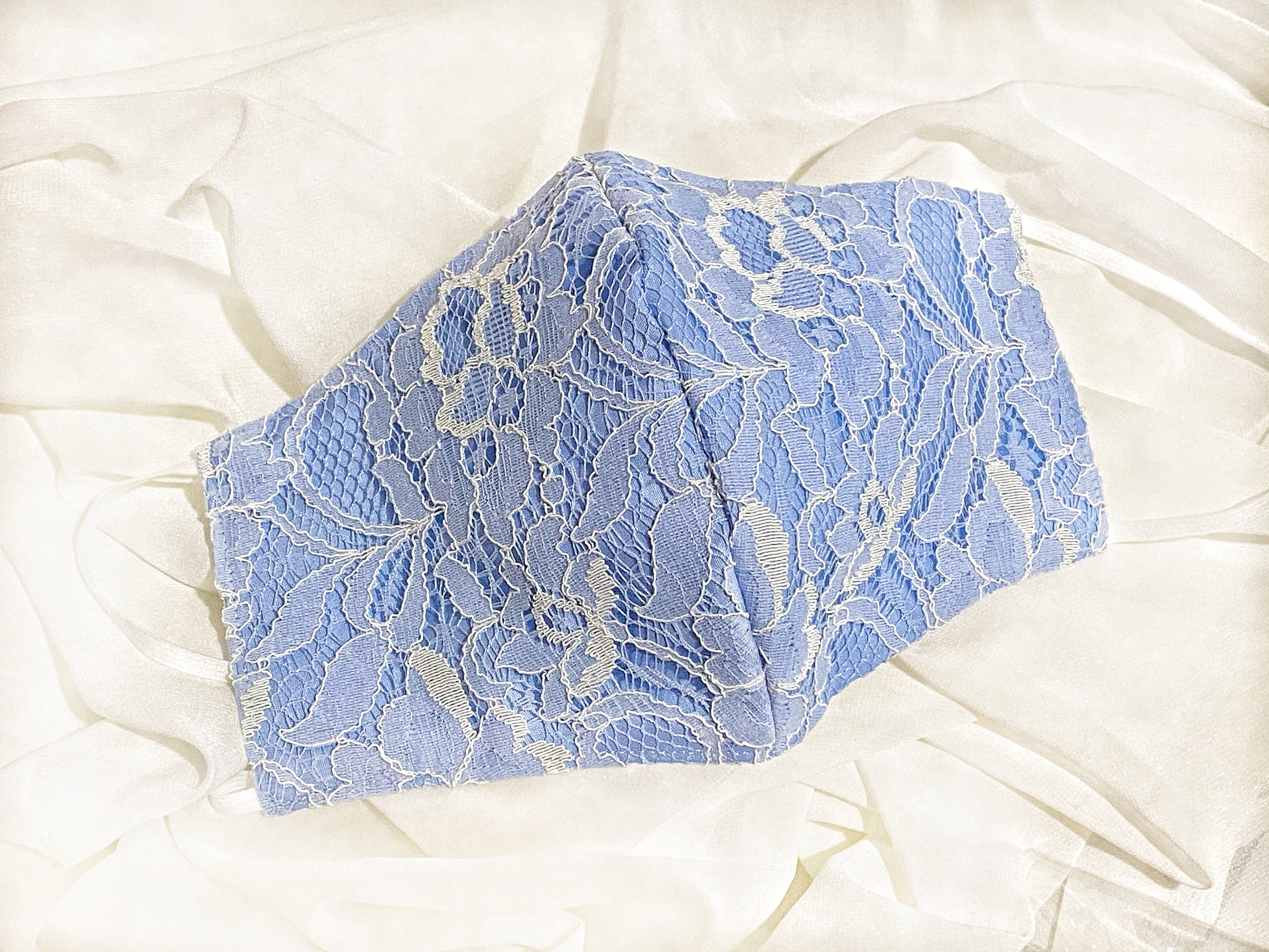ペールブルーとオフホワイトの2色で構成された大変珍しく繊細で上品な高級レースを贅沢に使用、品がありお洒落としても使えるマスクに仕上げました。