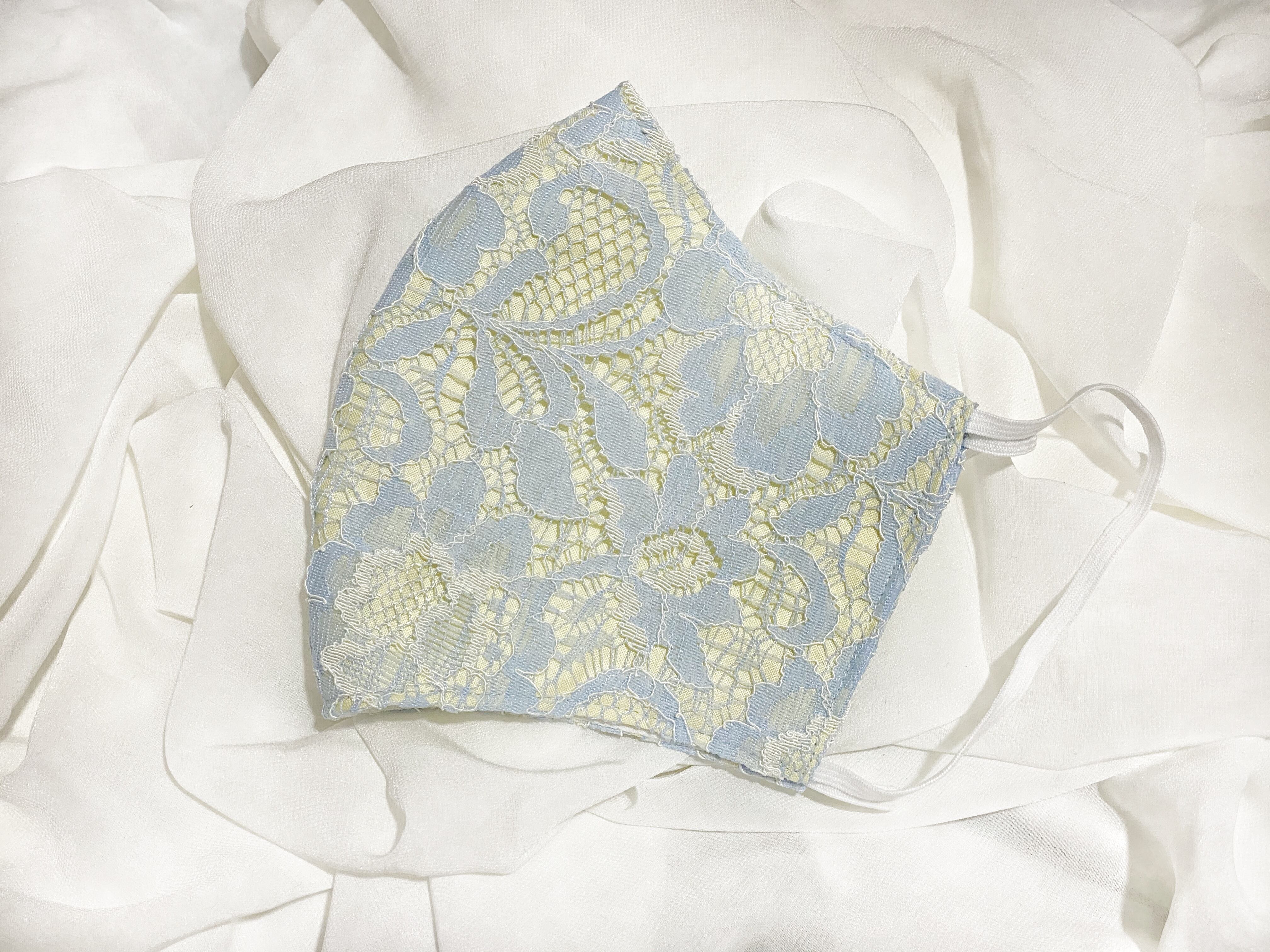 薄い水色とオフホワイトの2色で構成された大変珍しく繊細で上品な高級レースを贅沢に使用、品がありお洒落としても使えるマスクに仕上げました。