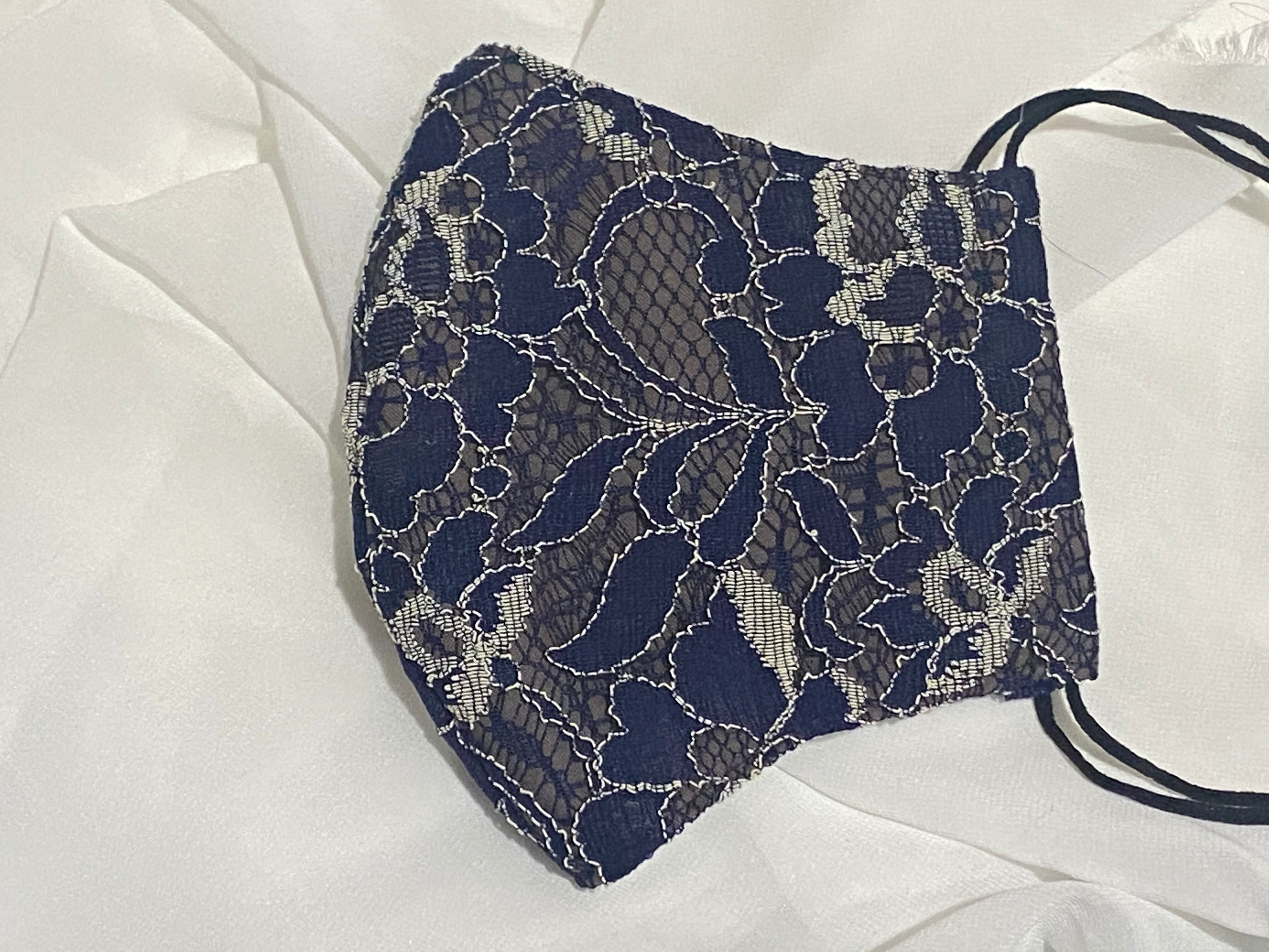 ネイビーとオフホワイトの2色で構成された大変珍しく繊細で上品な高級レースを贅沢に使用、品がありお洒落としても使えるマスクに仕上げました。