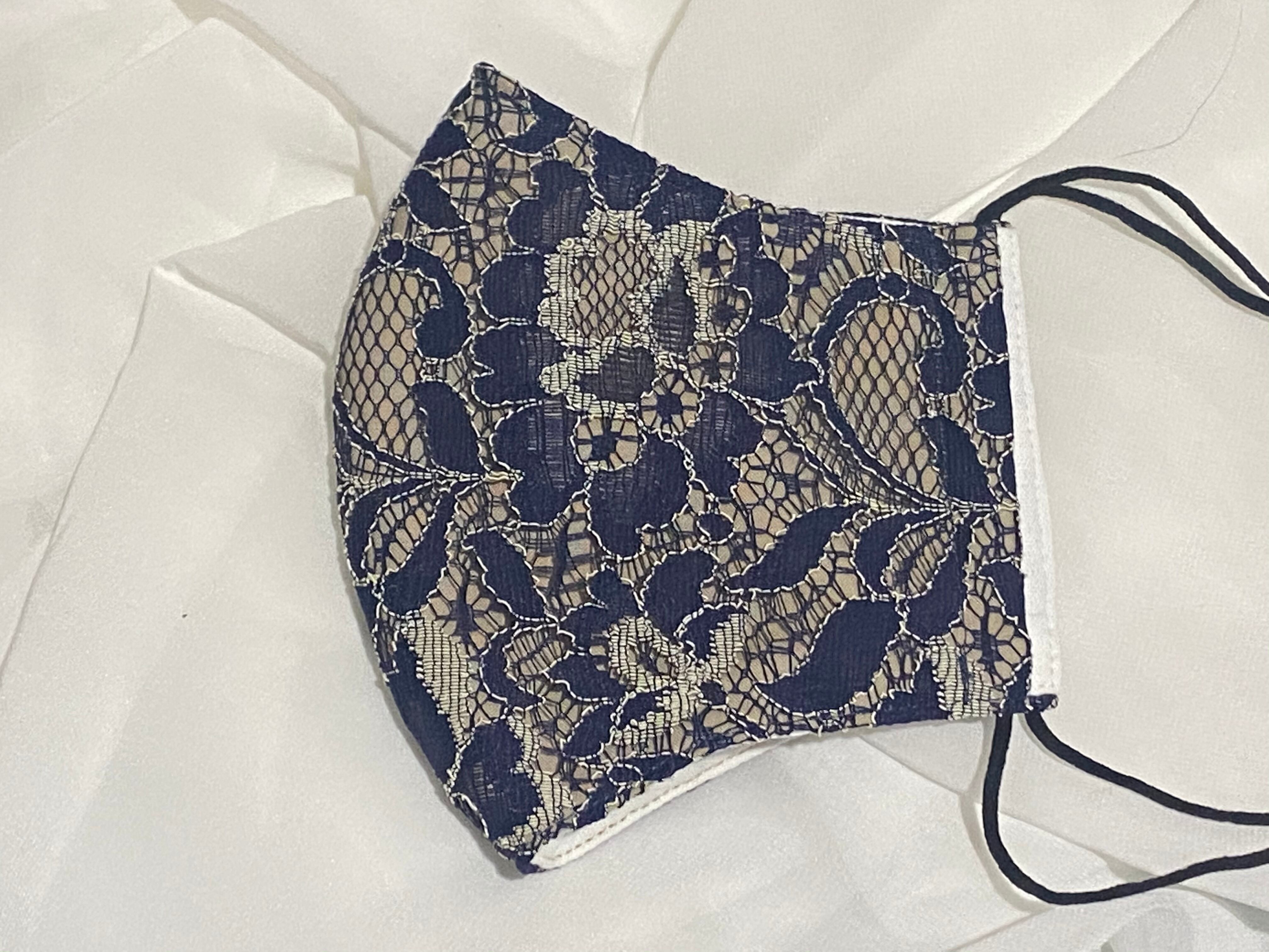 ネイビーとオフホワイトの2色で構成された大変珍しく繊細で上品な高級レースを贅沢に使用、品がありお洒落としても使えるマスクに仕上げました。