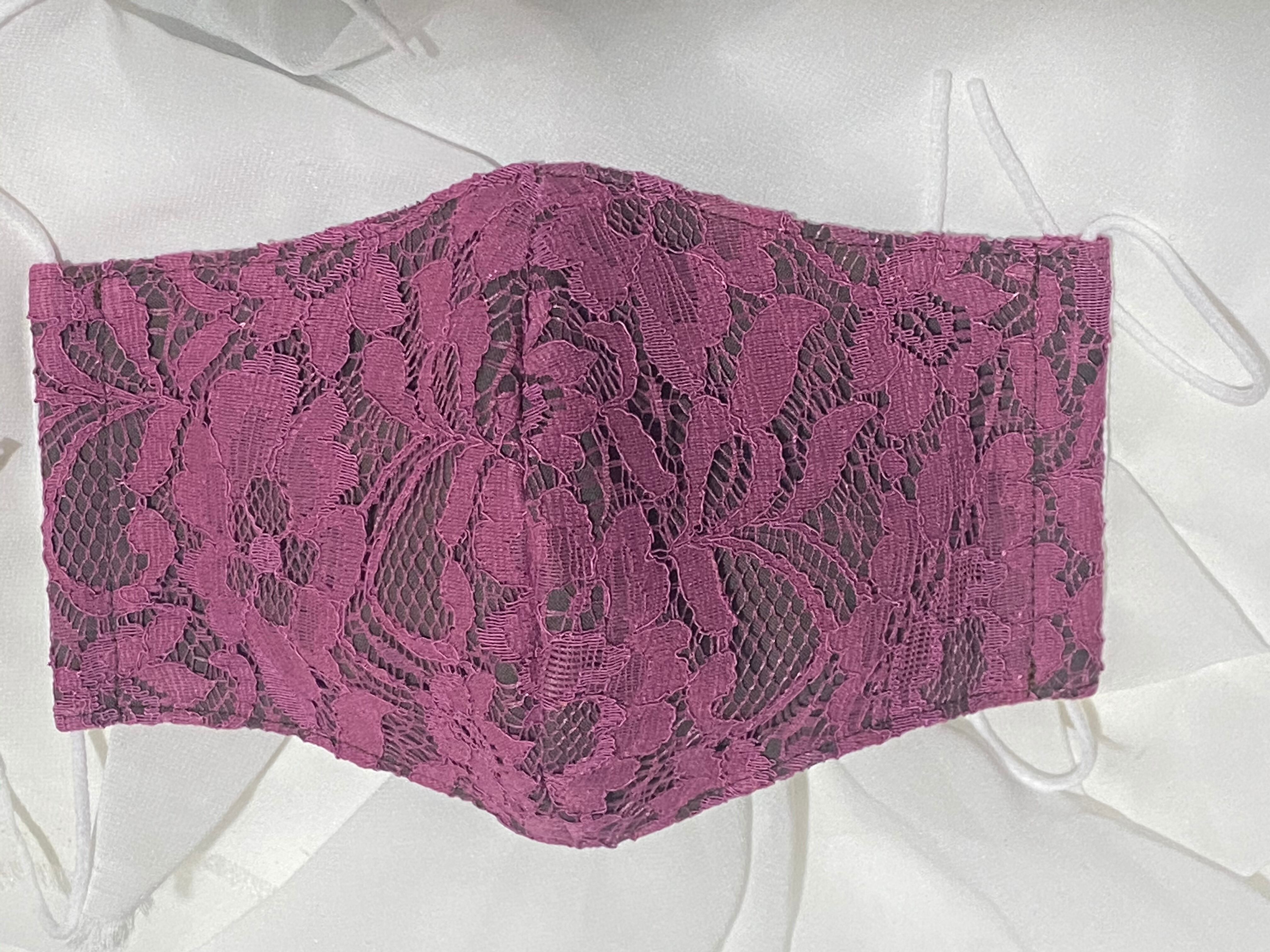 秋冬に使いやすい落ち着いた色合いのディープピンクで繊細かつ上品な高級レースを贅沢に使用、とても品がありお洒落としても使えるマスクに仕上げました。
