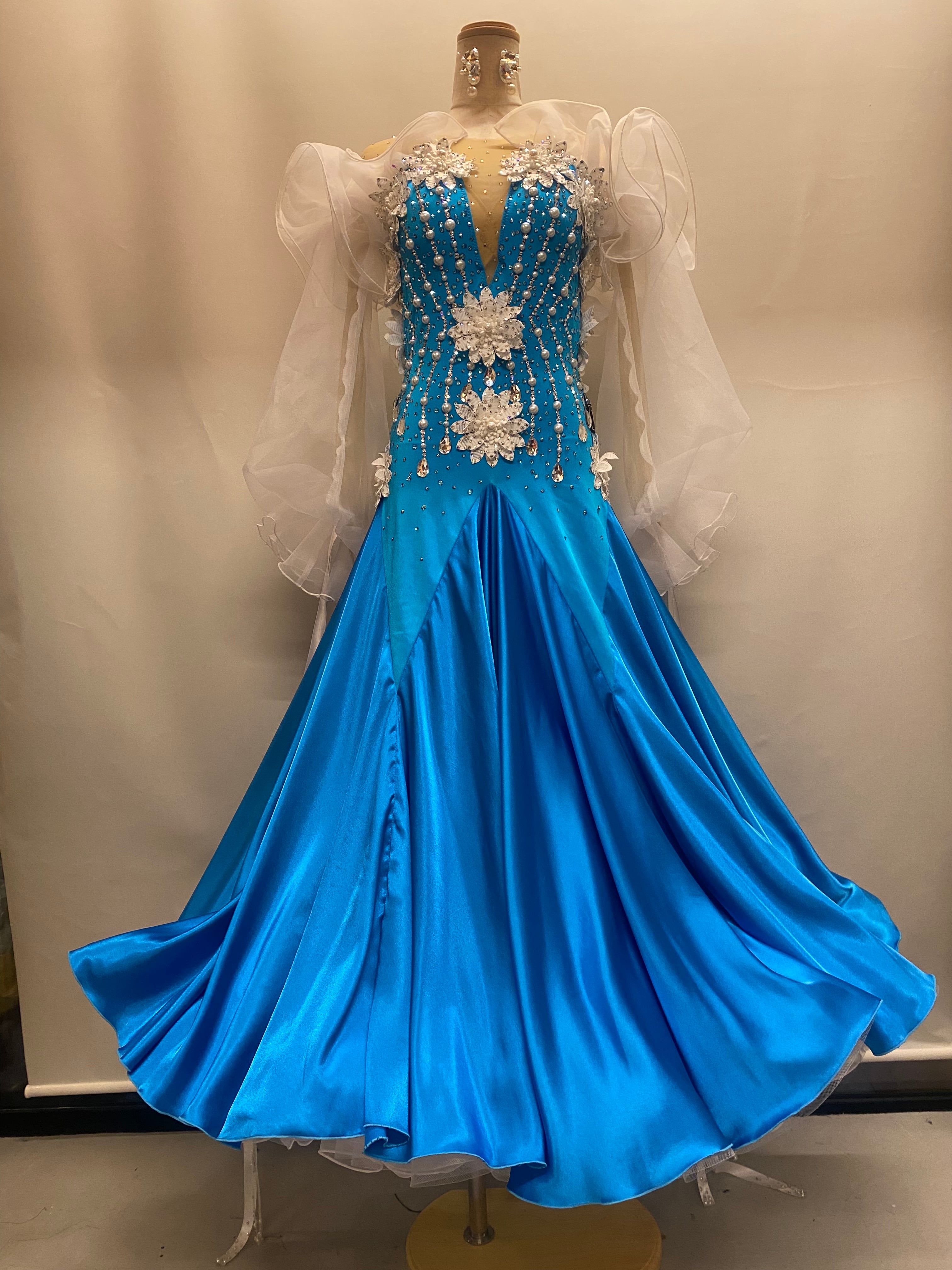 鮮やかなブルーとホワイトのコントラストが目を引く、可憐でエレガントなモダンドレスです✨