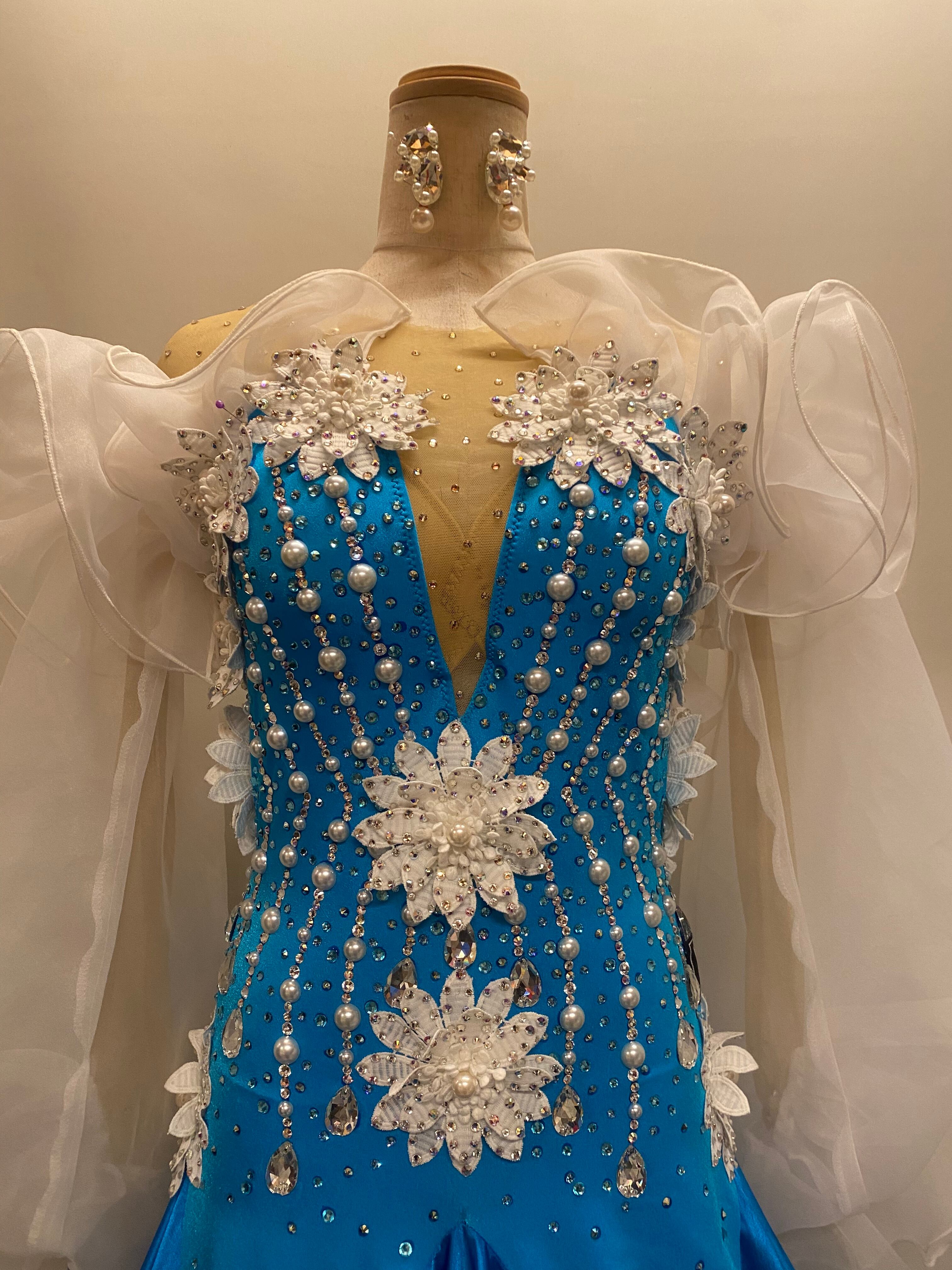 鮮やかなブルーとホワイトのコントラストが目を引く、可憐でエレガントなモダンドレスです✨